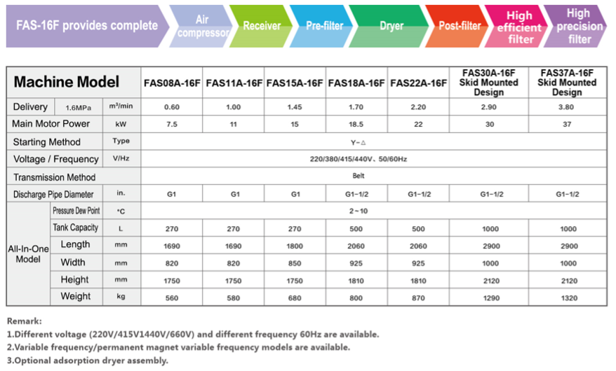- FAS-16F : Bao gồm Compressor, Air Receiver Tank, Pre-filter, Dryer, Post-filter, High efficiency filter, High precision filter
